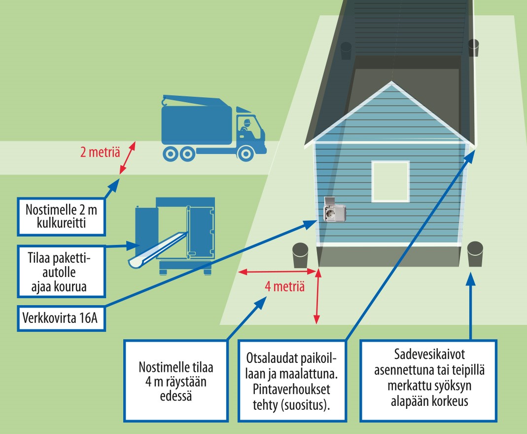 Nostimelle täytyy olla vapaata tilaa 4 metriä räystään edessä sekä 2 metriä leveä kulkureitti pihaan. Verkkovirtalähde saatavilla (16A).